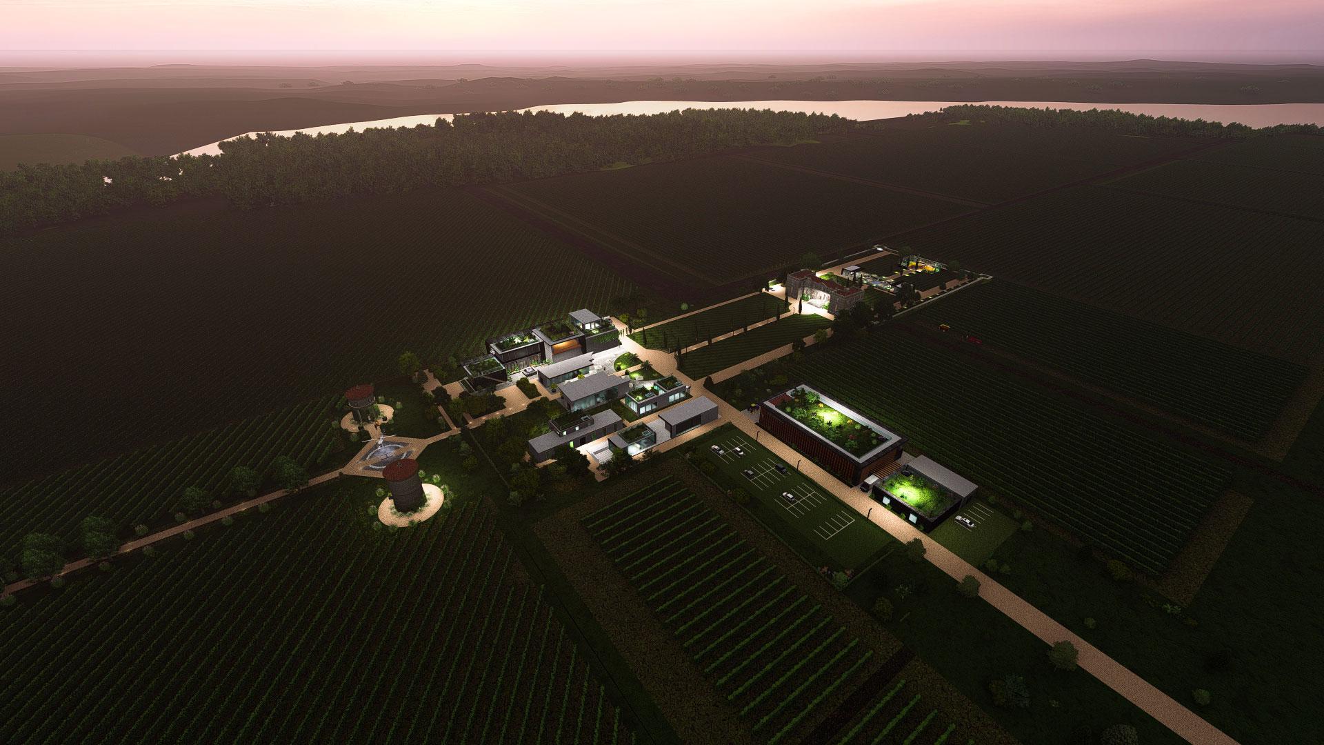 Proposition différente et plus contemporaine du Château de Grissac pour le chai ,les espaces de loisirs et le hameau.