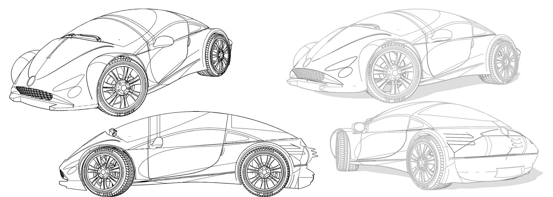 Recherches et créativité années 1995 début 2000. Roughs et images syntèse.Concept car électrique.Rough JC.Bougès