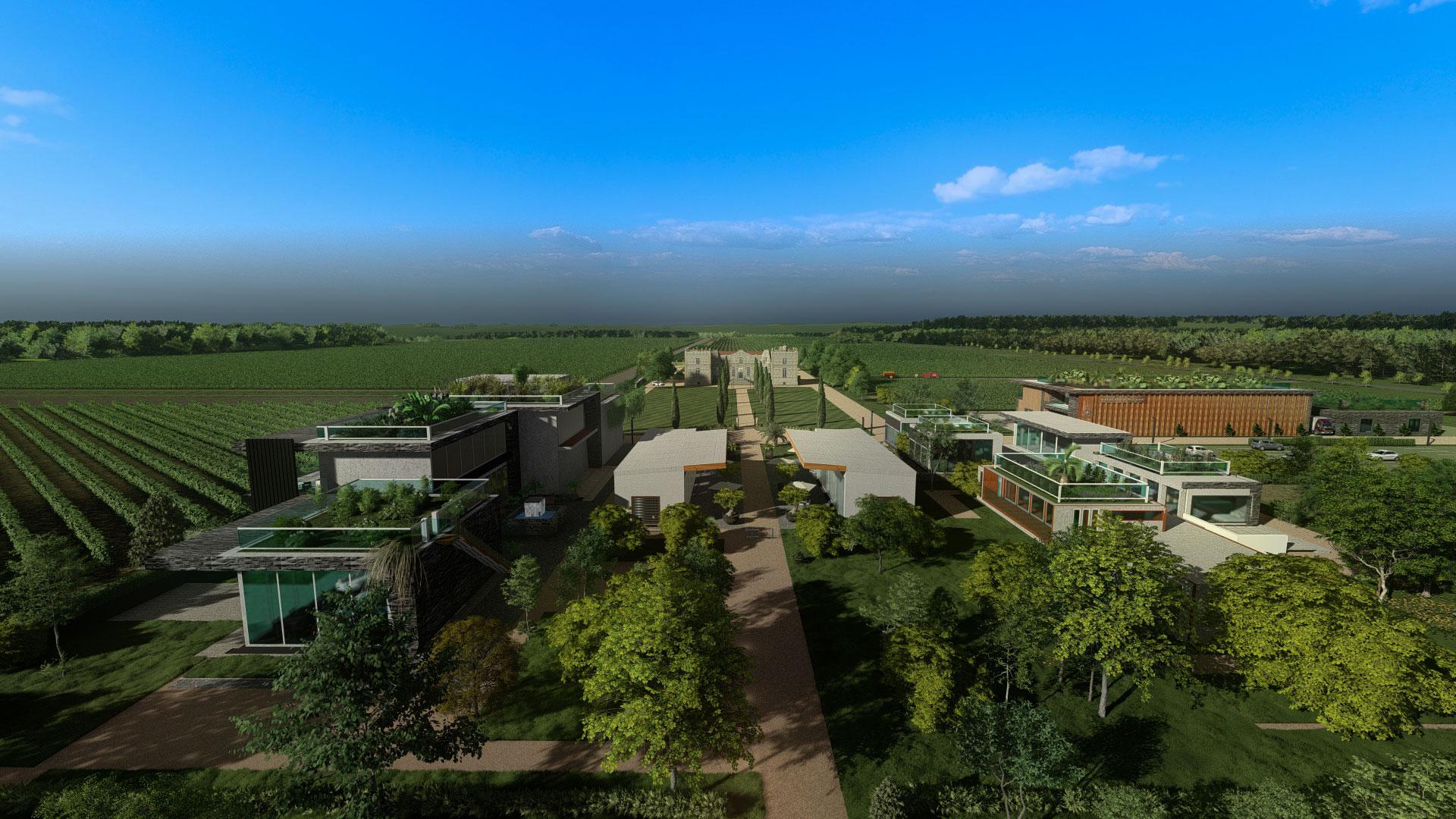 Proposition différente et plus contemporaine du Château de Grissac pour le chai ,les espaces de loisirs et le hameau.